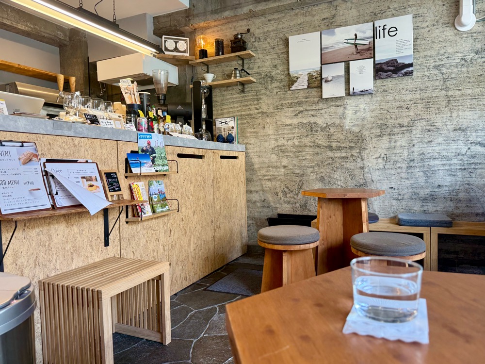 壁面にはサーフィンがデザインされた小さな写真の展示、棚にはコーヒーの道具や温かみのある照明が並んでいます。