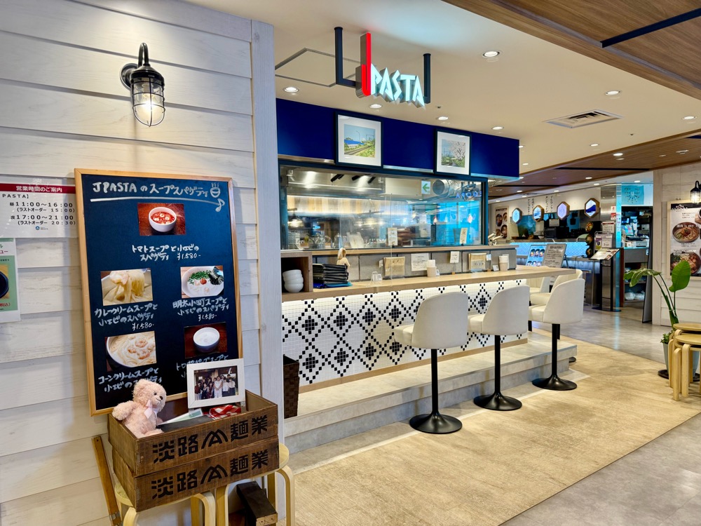 J PASTA 新藤沢店は、白と青を基調とした外観に赤いJの文字が目を引く店名ロゴが印象的。青い壁に飾られた湘南の風景画は、明るい照明で鮮やかに映えています。