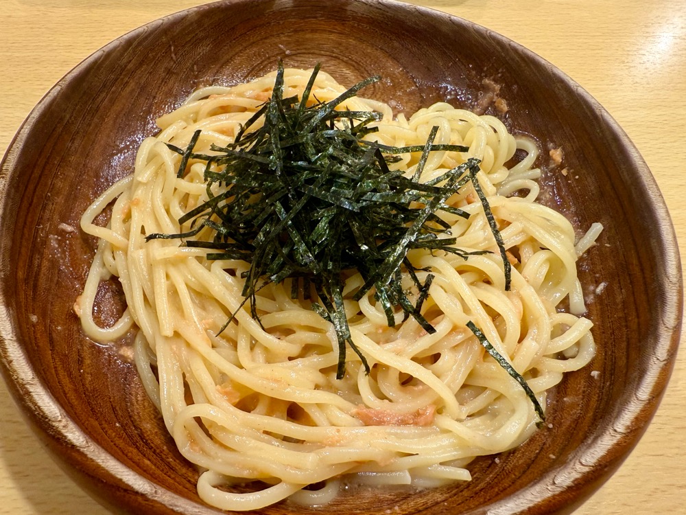 明太子スパゲッティは、明太子の塩気がほどよく効いていて、上にのった刻みのりが香ばしいアクセント。もっちりとして小麦の香りを楽しめるコシのある麺は生パスタならではです。