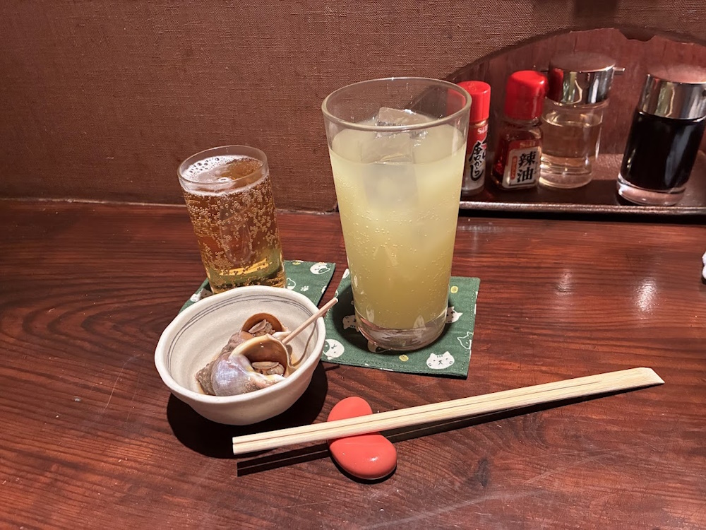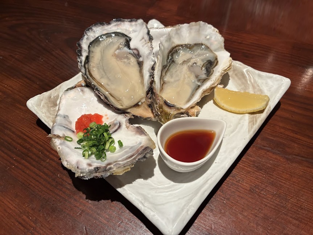今回はお通しのつぶ貝の煮付けに触発されて、生ガキにカキフライと貝づくし。