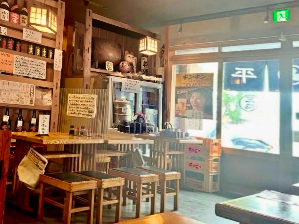 入り口横に積み上げられたホッピーのケースや店内に並ぶ酒瓶、招き猫やダルマの置物など、気取らない大衆酒場らしい空間が広がっています。