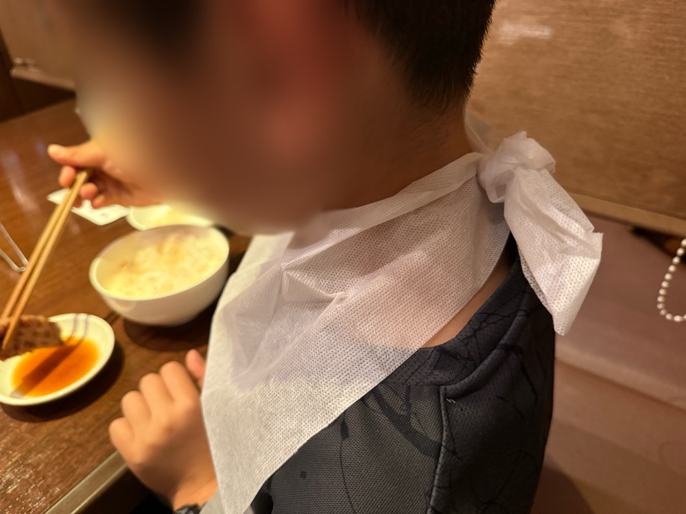 お肉を焼き始める前に紙エプロンを装着します。