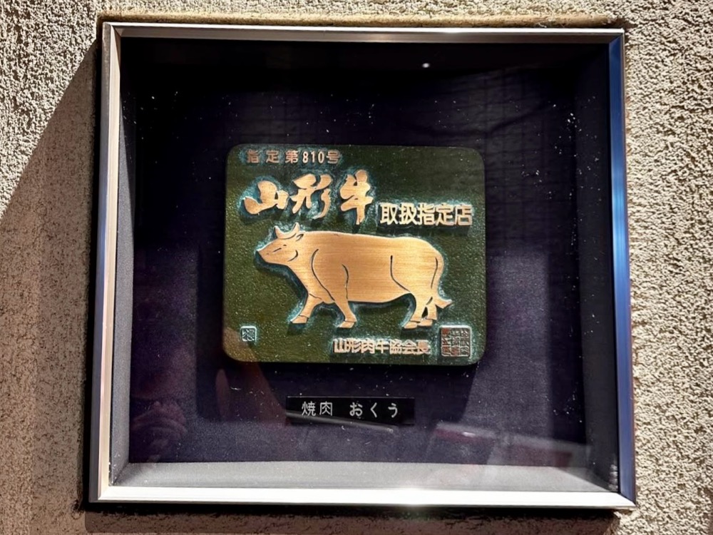 まず目を引くのは、エントランスに飾られているこちらの認定プレート。一頭買いで仕入れる山形牛の取扱指定店として、認定されている証です。