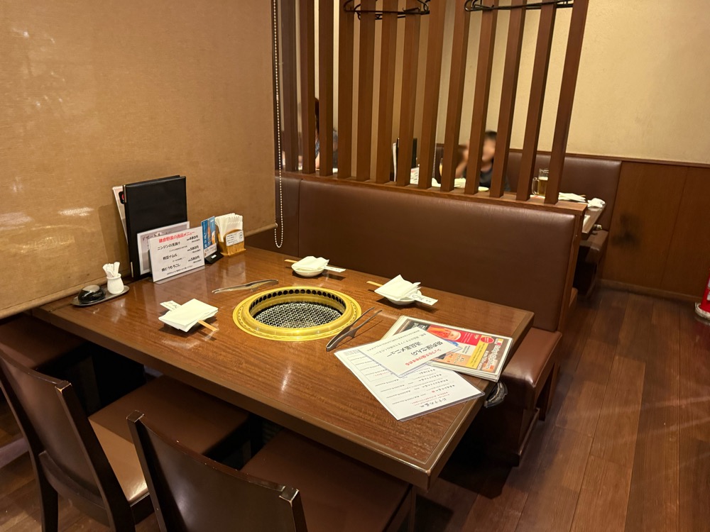 ベンチシートに子どもと並んで座ると、焼肉グリルからの取り分けもしやすく、家族での食事にちょうどいいと感じました。