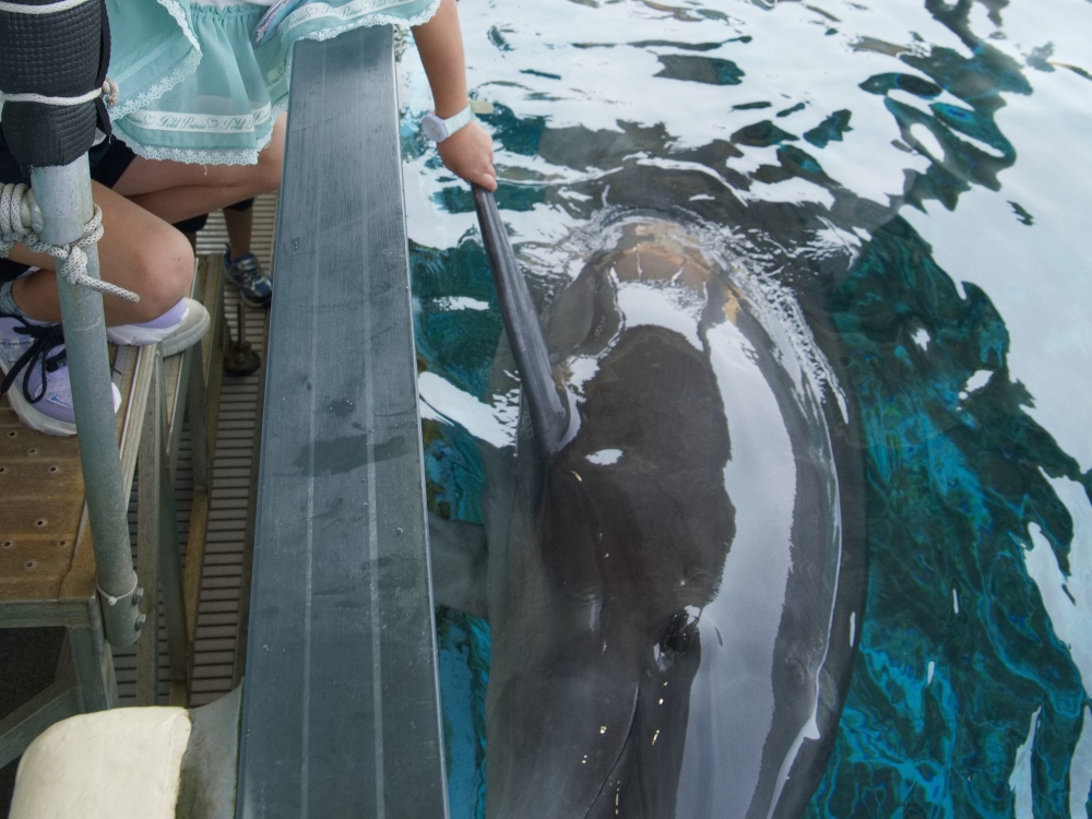 イルカの胸びれに握手する体験は、見ているだけでも特別感がありますが、実際にふれた娘は「つるつるしてる!」と大興奮。