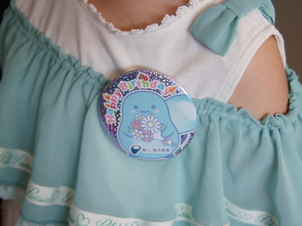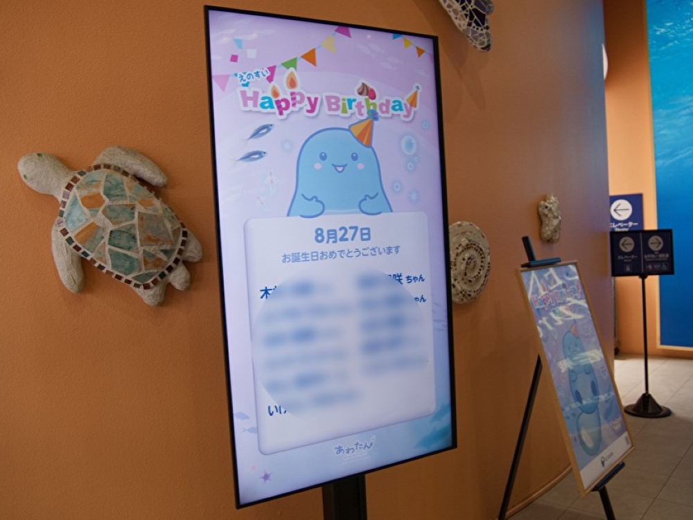 えのすいハッピーバースデーに申し込んでおくと、入口に設置されているバースデーボードに名前を載せてくれたり、えのすいオリジナルのホログラム缶バッジをつけてくれたりするんですよ。