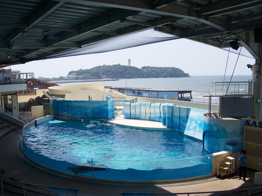 さあ、いよいよクライマックスのイルカショーです。屋外にあるイルカショースタジアムは、湘南の海と江の島を背景にした開放的な会場です。