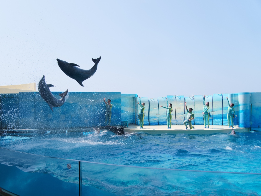 えのすいトリーター(飼育スタッフ)とイルカたちが心を通わせて、一緒に遊ぶような姿が見られます。イルカが手を振ったりジャンプをしたりするたびに、観客席から大きな歓声が上がっていました。