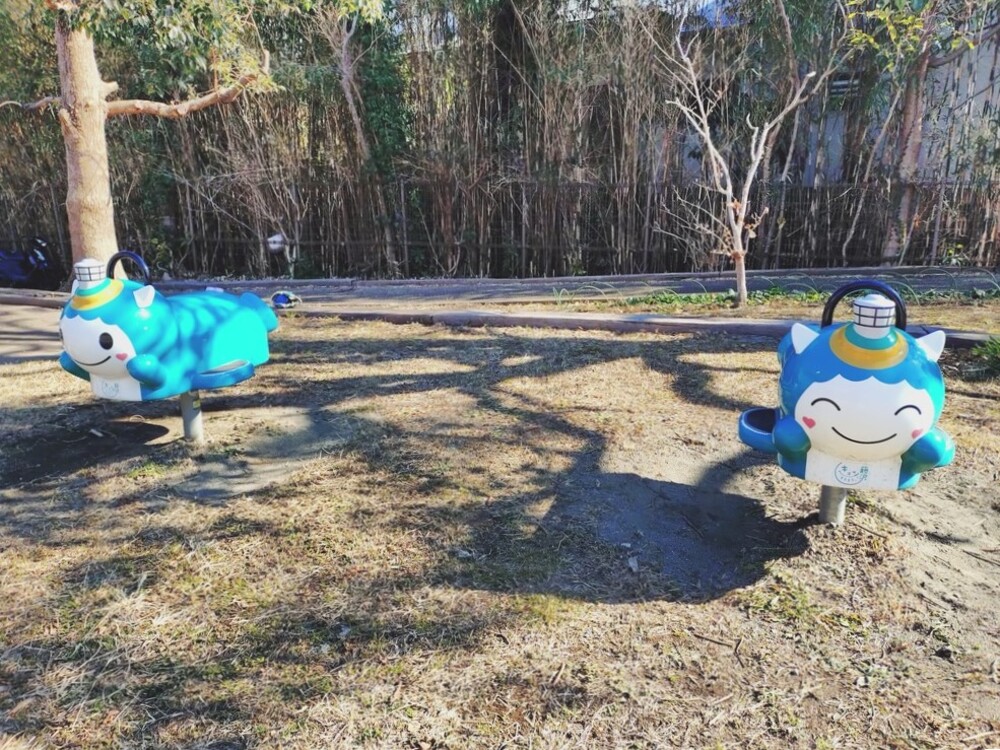 スイング遊具は藤沢市の公式マスコットキャラクターである「ふじキュン」をモチーフにしたもの。