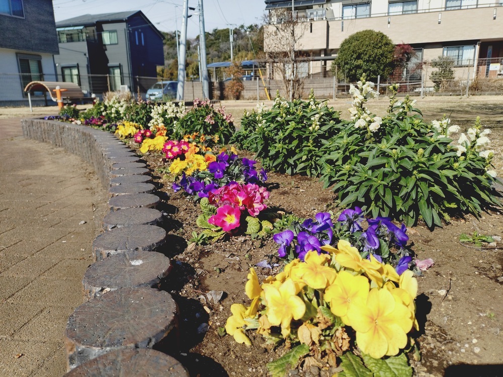 花壇はいつも手入れされていて、冬場でも色とりどりのお花を見ることができ、気持ちがとても明るくなります。