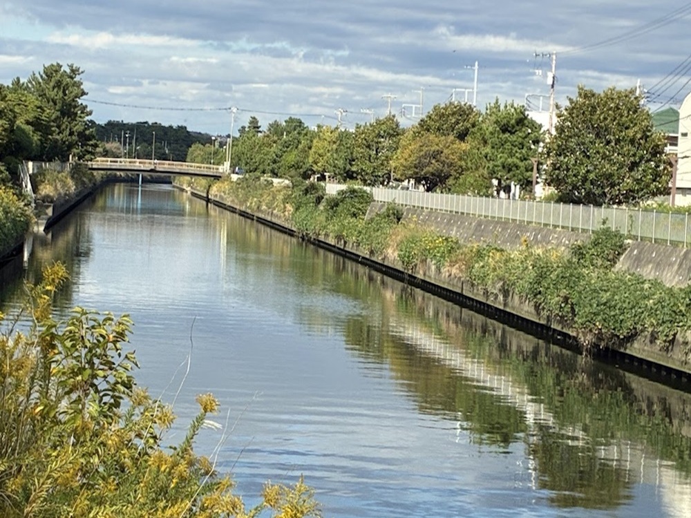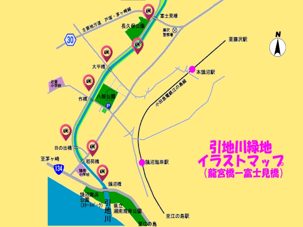 引地川緑地とは、ここ鵠沼の引地川河口から始まる川沿いの緑豊かな遊歩道。
