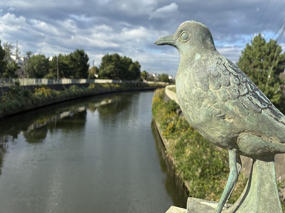 橋の上から川を眺めると、鯉たちがユラユラ泳ぎ、橋にかかる電灯に大きな水鳥が羽を休めるのを見かけることもしばしば。