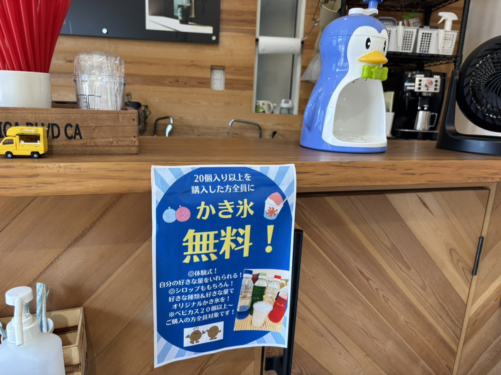 訪れて初めて知ったのですが、期間限定でベビーカステラを20個以上購入するとかき氷が無料でもらえるサービスがありました!